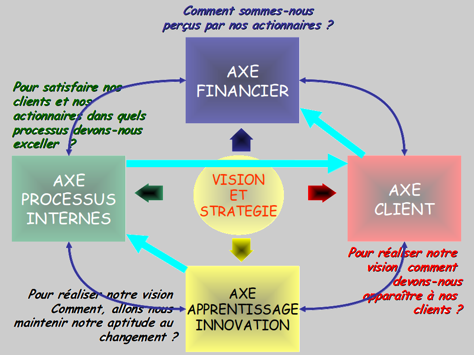 Ce modèle de tableau de bord stratégique s'appuie sur 4 axes (décrits par le schéma) :